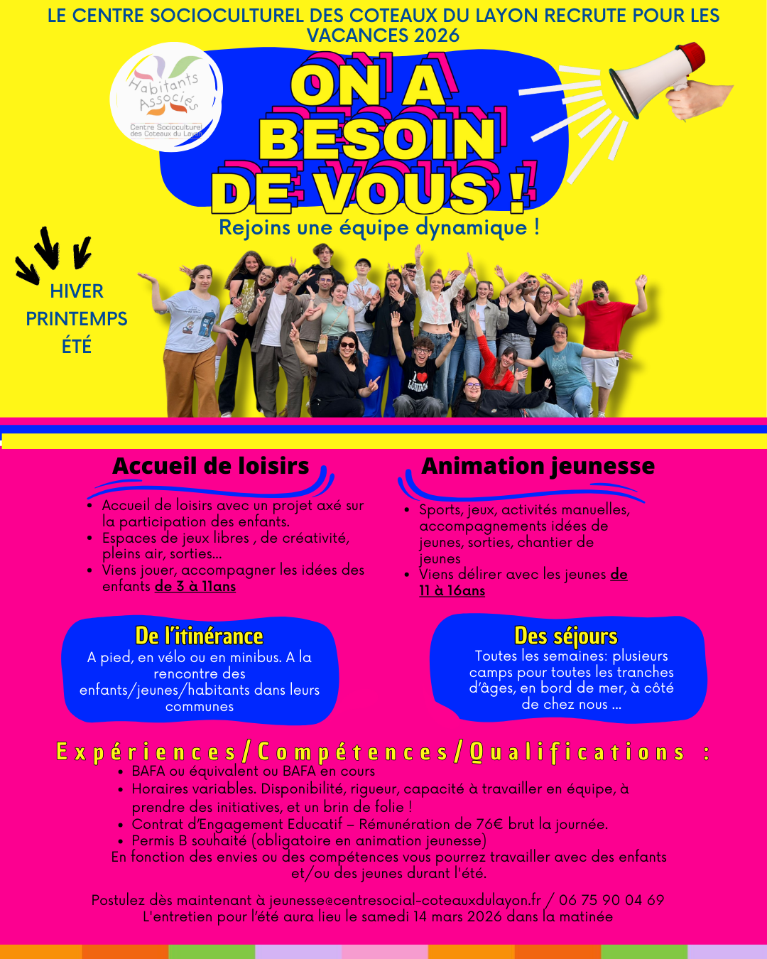 - Offre d’emploi pour des postes d’animateur·rice en séjours adaptés – été 2026 – (diffusée le 26/01/2026)